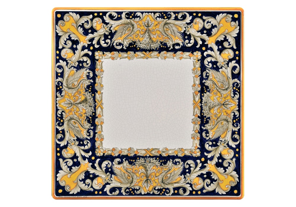 Lávový stôl Draghi Verdi z kolekcie Classic Line predstavuje spojenie umeleckej keramiky a tradičného talianskeho remesla. Dizajn vychádza z bohatej Umbrianskej keramickej tradície, ktorá počas renesancie preslávila majstrov ako Raphael, Pinturicchio či Perugino. Sýtočervené pozadie je husto vyplnené prepracovanými barokovými ornamentmi – akantovými listami, volutami a mušľovými motívmi – maľovanými v krémových a zlatistých odtieňoch, ktoré vytvárajú výrazný reliéfny efekt a dojem bohatého umeleckého rámu