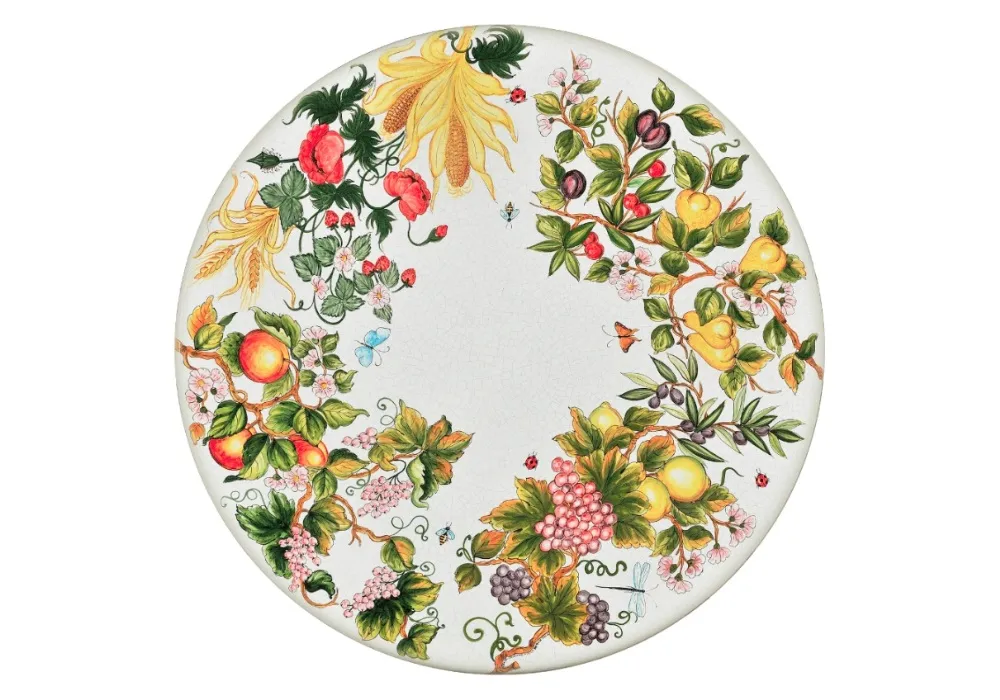 Lávový stôl Inglese z kolekcie Nature Line predstavuje spojenie umeleckej keramiky a tradičného talianskeho remesla. Dizajn vychádza z bohatej Umbrianskej keramickej tradície, ktorá počas renesancie preslávila majstrov ako Raphael, Pinturicchio či Perugino. Bohatá florálna kompozícia vytvára dojem jemnej botanickej ilustrácie s romantickým a prírodným charakterom. Precízne maľované ovocné a kvetinové motívy – hrušky, jablká, hrozno, figy, kvety a lístie – sa vinú po obvode kruhu a tvoria živý, farebný veniec plný detailov.