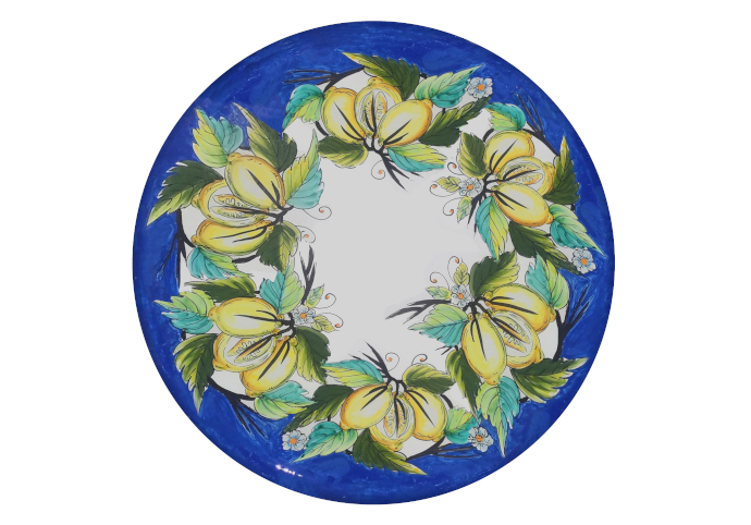 Lávový stôl Limoni Rosy z kolekcie Nature Line predstavuje spojenie umeleckej keramiky a tradičného talianskeho remesla. Dizajn vychádza z bohatej Umbrianskej keramickej tradície, ktorá počas renesancie preslávila majstrov ako Raphael, Pinturicchio či Perugino. Výrazný citrónový veniec na sýtom modrom pozadí pôsobí sviežo, energicky a mimoriadne dekoratívne. Žiarivo žlté citróny obklopené bohatými listami v odtieňoch zelenej a tyrkysovej vytvárajú harmonický kruh plný pohybu a prirodzenej vitality