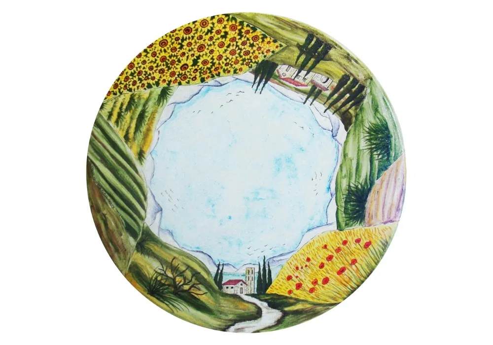 Lávový stôl Paesaggio Umbro z kolekcie Nature Line predstavuje spojenie umeleckej keramiky a tradičného talianskeho remesla. Dizajn vychádza z bohatej Umbrianskej keramickej tradície, ktorá počas renesancie preslávila majstrov ako Raphael, Pinturicchio či Perugino. Maľovaný krajinársky dekor pôsobí ako poetický pohľad do stredotalianskej krajiny, plný svetla, priestoru a pokojnej harmónie. Kompozícia zobrazuje mierne zvlnené polia v teplých žltých a zelených tónoch, cypresové aleje, vinice a kamenný vidiecky domček s červenou strechou, ktoré sa prirodzene zbiehajú smerom k svetlému stredovému otvoru.