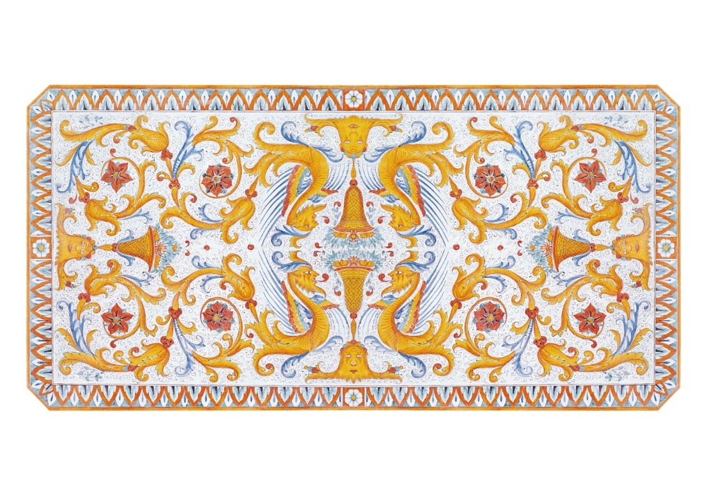Lávový stôl Raffaellesco Pienoz kolekcie Classic Line predstavuje spojenie umeleckej keramiky a tradičného talianskeho remesla. Dizajn vychádza z bohatej Umbrianskej keramickej tradície, ktorá počas renesancie preslávila majstrov ako Raphael, Pinturicchio či Perugino. Bohato ornamentálny dekor v štýle Raffaellesco pieno pôsobí mimoriadne slávnostne, luxusne a klasicky, s jasným odkazom na vrcholnú taliansku renesančnú tradíciu. Celú plochu vypĺňa hustá, symetrická kompozícia fantastických bytostí, pohárov, palmetových listov a volutových ornamentov, ktoré sa rytmicky prelínajú v dokonale vyváženom usporiadaní.