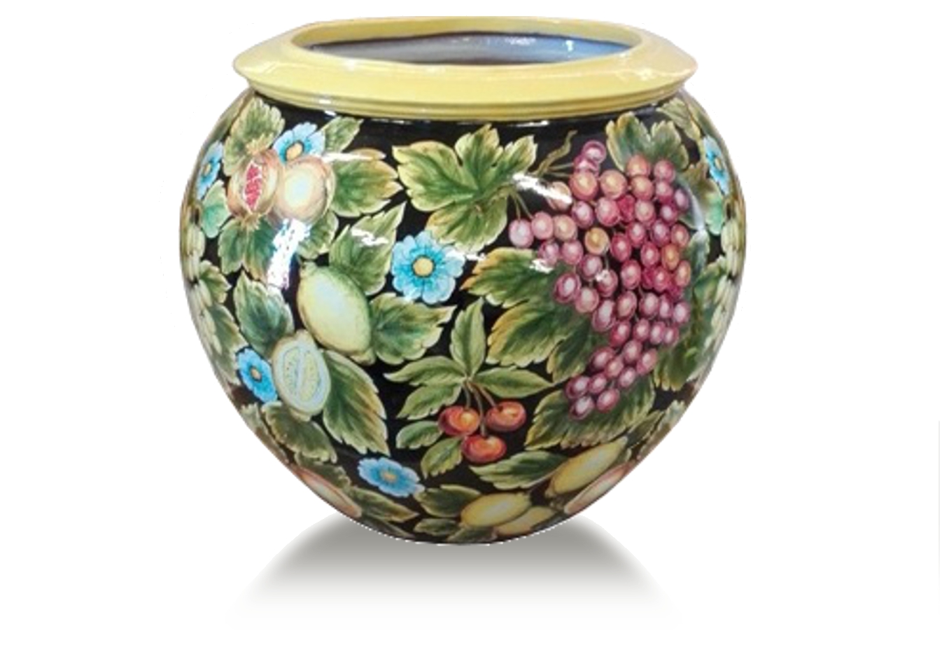 Model Decoro Frutta Fondo Nero vychádza z tradičných talianskych nádob, pričom jeho charakteristický guľovitý tvar prináša mäkkosť a vizuálnu rovnováhu do každého priestoru. Vzorovaná povrchová úprava s motívom tmavého ovocia zvýrazňuje jeho objem a zároveň mu dodáva moderný, minimalistický výraz, ktorý kontrastuje s prirodzenou štruktúrou terakoty. Ideálny ako výrazný solitérny prvok bez potreby kombinovania variantov. Je glazovaná a následne vypaľovaná v peciach pri teplote približne 1000 °C, vďaka čomu získava sýte a trvácne farby, ktoré si zachovávajú svoju intenzitu aj pri dlhodobom vystavení slnku.