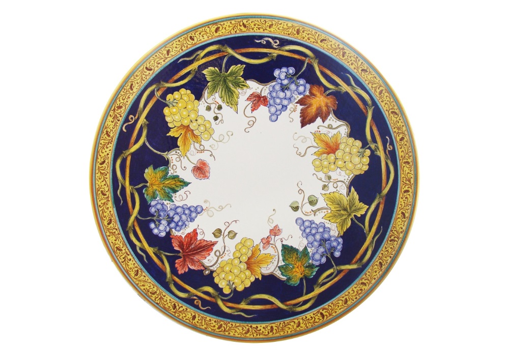 Lávový stôl Uva Nuova z kolekcie Nature Line predstavuje spojenie umeleckej keramiky a tradičného talianskeho remesla. Dizajn vychádza z bohatej Umbrianskej keramickej tradície, ktorá počas renesancie preslávila majstrov ako Raphael, Pinturicchio či Perugino. Elegantný hroznový dekor vyniká kontrastom hlbokého kráľovsky modrého pozadia a bohatej zlatisto‑žltej ornamentiky, ktorá dodáva celku luxusný a reprezentatívny charakter. Po obvode dosky sa rozprestiera harmonický veniec zo strapcov bieleho a modrého hrozna, doplnený plasticky maľovanými listami v odtieňoch zelenej, okrovej a vínovej.